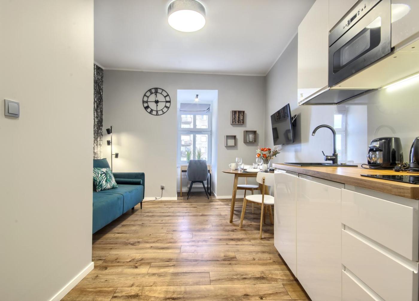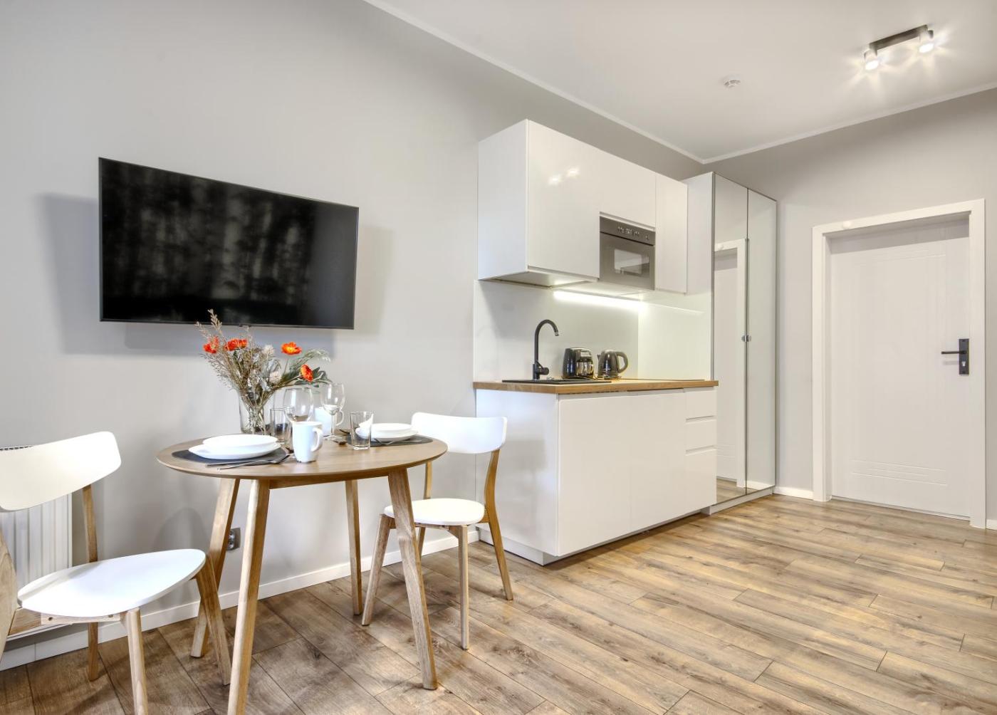 Apartament z 1 sypialnią. Boasting a private entrance, this apartment also includes 1 bedroom, a seating area and 1 bathroom with a shower and a hairdryer. Guests can make meals in the kitchen that has a stovetop, a refrigerator, kitchenware and a microwave. The apartment offers a flat-screen TV, a washing machine, a tea and coffee maker, a dining area as well as city views. The unit has 1 bed. Apartament - 2 osobowy. Powierzchnia pokoju ok.: 20 mkw.