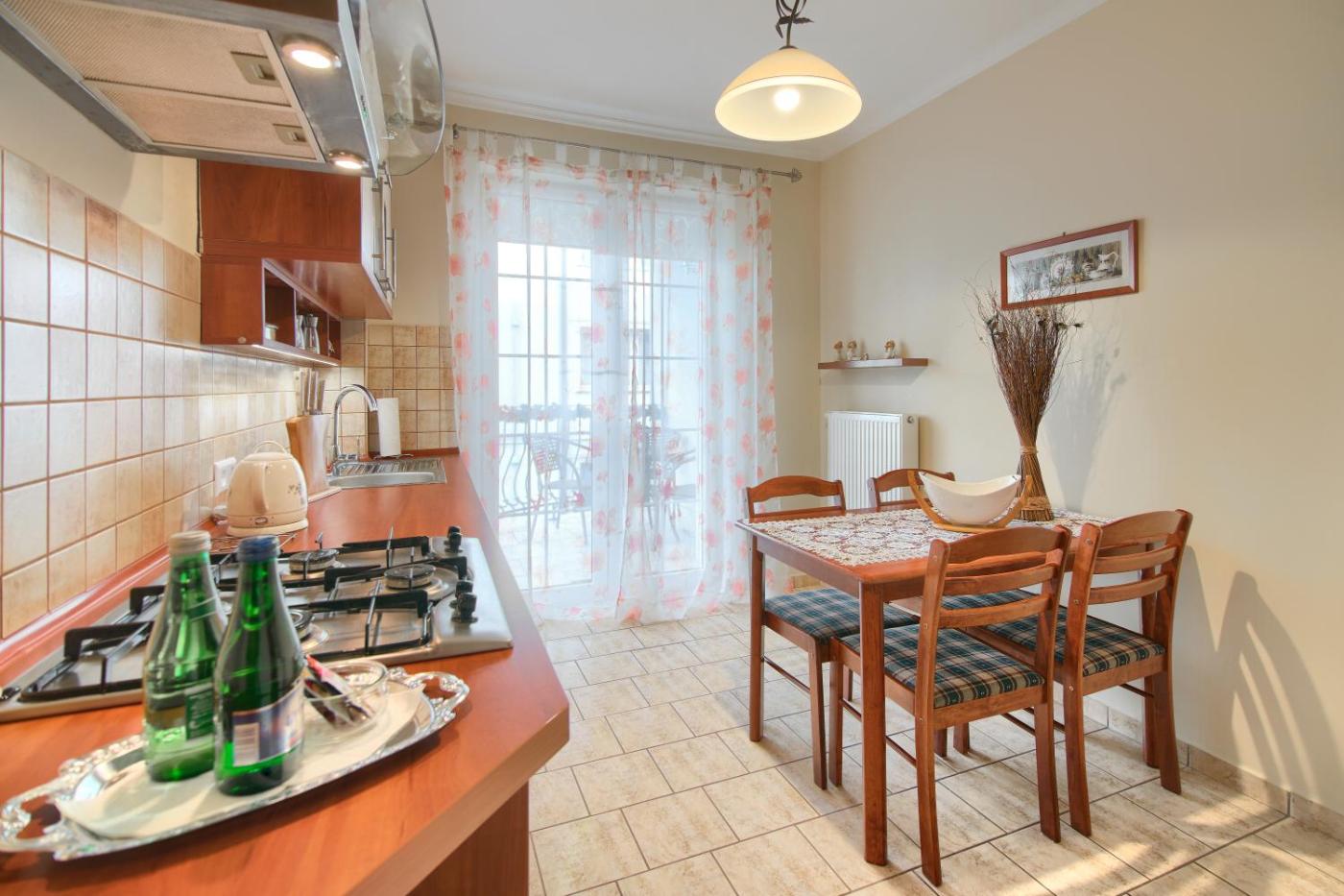 Apartament typu Deluxe. Featuring a private entrance, this apartment is comprised of 1 living room, 1 separate bedroom and 1 bathroom with a walk-in shower and a hairdryer. Guests will find a stovetop, a refrigerator, a dishwasher and kitchenware in the kitchenette. The apartment also has a barbecue. Boasting a terrace with garden views, this apartment also offers a washing machine and a flat-screen TV with cable channels. The unit offers 2 beds. Apartament - 2 osobowy. Powierzchnia pokoju ok.: 33 mkw.